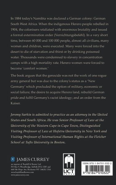 Questions relating to human rights are very much in the news, yet genocides in Africa, especially those that occurred during colonial times, are understudied. The history of the Herero genocide has been examined by very few writers and almost no-one from Africa. Sarkin's book deals with the issues from an entirely different point of view, provides new information not included in the existing literature, and proposes understandings from an alternative position. Southern Africa (South Africa, Botswana, Lesotho, Swaziland, Namibia and Zimbabwe): University of Cape Town Press/Juta