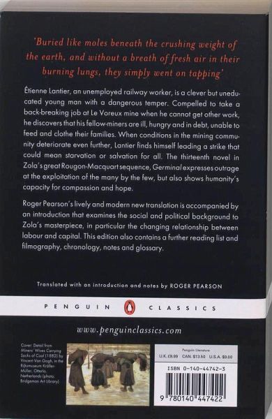 Considered by André Gide to be one of the ten greatest novels in the French language, Émile Zola's Germinal is a brutal depiction of the poverty of a mining community in northern France Étienne Lantier, an unemployed railway worker, is a clever but uneducated young man with a dangerous temper. Compelled to take a back-breakin job at Le Voreux mine when he cannot get other work, he discovers that his fellow miners are ill, hungry and in debt, unable to feed and clothe their families. When conditions in the mining community deteriorate even further, Lantier finds himself leading a strike that could mean starvation or salvation for all. The thirteenth novel in Zola's great Rougon-Macquart sequence, Germinal expresses outrage at the exploitation of the many by the few, but also shows humanity's capacity for compassion and hope. Translated with an introduction by Roger Pearson in Penguin Classics If you enjoyed Germinal, you might like Zola's Thérèse Raquin, also available in Penguin Classics.