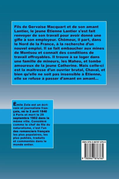 Fils de Gervaise Macquart et de son amant Lantier, le jeune Étienne Lantier s'est fait renvoyer de son travail pour avoir donné une gifle à son employeur. Chômeur, il part, dans le Nord de la France, à la recherche d'un nouvel emploi. Il se fait embaucher aux mines de Montsou et connaît des conditions de travail effroyables. Il trouve à se loger dans une famille de mineurs, les Maheu, et tombe amoureux de la jeune Catherine. Mais celle-ci est la maîtresse d'un ouvrier brutal, Chaval, et bien qu'elle ne soit pas insensible à Étienne, elle se refuse à passer d'amant en amant...
