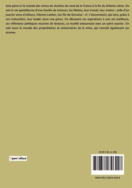 "Germinal" d'Émile Zola est un roman naturaliste qui explore les conditions de vie difficiles des mineurs dans le nord de la France au XIXe siècle. L'histoire commence avec l'arrivée d'Étienne Lantier, un ouvrier sans emploi, qui cherche du travail dans les mines de charbon de Montsou. Il est embauché comme herscheur, un travail épuisant consistant à pousser les wagonnets de charbon. À travers les yeux d'Étienne, le lecteur découvre la vie quotidienne des mineurs, marquée par la pauvreté, l'exploitation et les dangers constants du travail souterrain. Le roman dépeint également les tensions sociales croissantes entre les ouvriers et les propriétaires des mines, qui culminent en une grève violente. Zola décrit avec précision les conditions de travail inhumaines, les relations familiales et les espoirs de changement social. "Germinal" est une critique acerbe du capitalisme industriel et un plaidoyer pour la justice sociale, illustrant la lutte des classes et la solidarité ouvrière face à l'oppression.