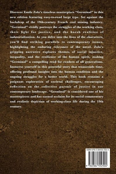 Discover Emile Zola's timeless masterpiece "Germinal" in this new edition featuring easy-to-read large type. Set against the backdrop of the 19th-century French coal mining industry, "Germinal" vividly portrays the struggles of the working class, their fight for justice, and the harsh realities of industrialization. As you delve into the lives of the characters, you'll find striking parallels to contemporary issues, highlighting the enduring relevance of the novel. Zola's gripping narrative explores themes of social injustice, inequality, and the resilience of the human spirit, making "Germinal" a compelling read for readers of all generations. Immerse yourself in this powerful story that transcends time, offering profound insights into the human condition and the ongoing struggles for a better world. This book remains a poignant exploration of societal challenges, encouraging reflection on the collective pursuit of justice in our contemporary landscape. "Germinal" is considered one of his masterpieces and has earned acclaim for its social commentary and realistic depiction of working-class life during the 19th century.