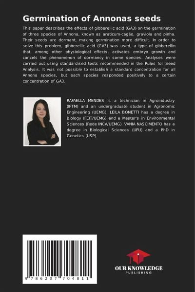 This paper describes the effects of gibberellic acid (GA3) on the germination of three species of Annona, known as araticum-cagão, graviola and pinha. Their seeds are dormant, making germination more difficult. In order to solve this problem, gibberellic acid (GA3) was used, a type of gibberellin that, among other physiological effects, activates embryo growth and cancels the phenomenon of dormancy in some species. Analyses were carried out using standardised tests recommended in the Rules for Seed Analysis. It was not possible to establish a standard concentration for all Annona species, but each species responded positively to a certain concentration of GA3.