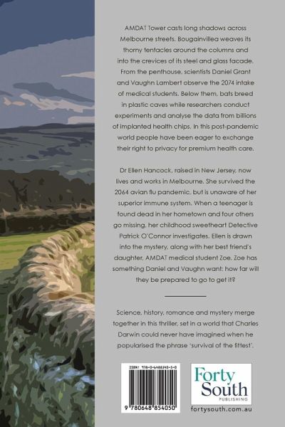 Science, history, romance and mystery merge together in this thriller, set in a world that Charles Darwin could never have imagined when he popularised the phrase 'survival of the fittest'. AMDAT Tower casts long shadows across Melbourne streets. Bougainvillea weaves its thorny tentacles around the columns and into the crevices of its steel and glass facade. From the penthouse, scientists Daniel Grant and Vaughn Lambert observe the 2074 intake of medical students. Below them, bats breed in plastic caves while researchers conduct experiments and analyse the data from billions of implanted health chips. In this post-pandemic world people have been eager to exchange their right to privacy for premium health care. Dr Ellen Hancock, raised in New Jersey, now lives and works in Melbourne. She survived the 2064 avian flu pandemic, but is unaware of her superior immune system. When a teenager is found dead in her home town and four others go missing, her childhood sweetheart Detective Patrick O'Connor investigates. Ellen is drawn into the mystery, along with her best friend's daughter, AMDAT medical student Zoe. Zoe has something Daniel and Vaughn want: how far will they be prepared to go to get it?