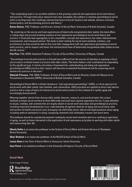 Gerontological Social Work in Action introduces "anti-oppression gerontology" (AOG), a critical approach to social work with older adults, their families, and communities. AOG principles are applied to direct and indirect practice and a range of topics of relevance to social work practice in the context of a rapidly aging and increasingly diverse world. Weaving together stories from diverse older adults, theories, research, and practical tools, this unique textbook prompts social workers to think differently and push back against oppressive forces. It pays attention to issues, realities, and contexts that are largely absent in social work education and gerontological practice, including important developments in our understanding of age/ism; theories of aging and social work; sites and sectors of health and social care; managing risk and frailty; moral, ethical and legal questions about aging including medical assistance in dying; caregiving; dementia and citizenship; trauma; and much more. This textbook should be considered essential reading for social work students new to or seeking to specialize in aging, as well as those interested in the application of anti-oppressive principles to working with older adults and researching later life.