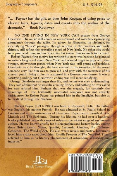 "... (Payne) has the gift, as does John Keegan, of using prose to elevate facts, figures, dates and events into the realms of the dramatic." -Amazon Reviewer NO ONE LIVING IN NEW YORK CAN escape from George Gershwin. His music still comes in unrestrained and sometimes paralyzing abundance through the radio. Its gaiety, its flippancy, its violence, its electrifying "blues" passages, though written in the twenties and early thirties, still reflect the prevailing mood of New York. No other city could have produced him, and no other city has taken him so much to its heart. Robert Payne's first motive for writing his story was because he planned to write a long novel about New York, and wanted to get to grips with that strange, effervescent period when New York was still young and reckless. Gershwin was, he thought, the best symbol of the twenties. In the novel someone very like him was to grow old and grey with the weariness of his eternal youth, dying at last in a quarrel in a Bowery doss-house. It was a satisfying ending, but Gershwin's ending was still more satisfying. George Gershwin was larger than life, and no one was ever so demanding. They said of him that he was like a young Prince, and nothing he ever asked for was refused him. Perhaps that was the tragedy, for certainly the stereotype of the brilliantly successful composer was not entirely satisfactory. So Robert Payne has painted him in the limelight, but also as he walked through the Shadows. Pierre Stephen Robert Payne (4 December 1911-3 March 1983), was a novelist, historian, poet, and biographer. Born in Cornwall, the son of an English naval architect, and with a French mother. He worked as a shipbuilder and then for a time with the Inland Revenue. In 1941 he became an armament officer and chief camouflage officer for British Army Intelligence at Singapore. In the summer of 1946, Payne traveled to China and visited with and interviewed Mao Zedong in Yenan. During the interview Mao correctly predicted that it would only take the Communist forces a year and a half to conquer China once the armistice with Chiang Kai-shek and his followers was broken. Payne had more than 110 books published, novels, histories and biographies.