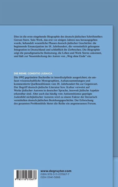 Dies ist die erste eingehende Biographie des deutsch-jüdischen Schriftstellers Gerson Stern. Sein Werk, das erst vor einigen Jahren neu herausgegeben wurde, behandelt wesentliche Phasen deutsch-jüdischer Geschichte: die beginnende Emanzipation im 18. Jahrhundert, die vermeintlich gelungene Integration in Deutschland und schließlich ihr Zerbrechen. Einen auf das deutsch-jüdische Kulturmilieu beschränkten Ruhm erwarb sich Stern mit dem Roman "Weg ohne Ende" (1934) und der in Fortsetzungen in der Jüdischen Rundschau gedruckten Erzählung "Auf drei Dingen steht die Welt" (1935). Einen weiteren bedeutenden Roman "Die Waage der Welt" schrieb Stern nach seiner Emigration 1939 nach Palästina/Israel, wo er 1948 in hebräischer Übersetzung erschien. Die Biographie zeigt die paradigmatische Bedeutung, die Leben und Werk Sterns zukommt und lädt zur Neuentdeckung dieses Autors ein.