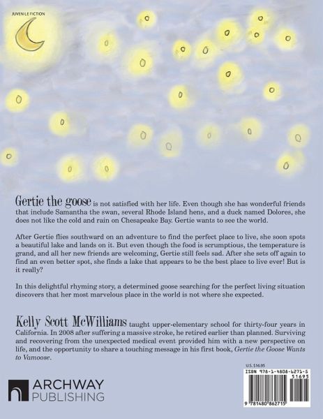 Gertie the goose is not satisfied with her life. Even though she has wonderful friends that include Samantha the swan, several Rhode Island hens, and a duck named Dolores, she does not like the cold and rain on Chesapeake Bay. Gertie wants to see the world. After Gertie flies southward on an adventure to find the perfect place to live, she soon spots a beautiful lake and lands on it. But even though the food is scrumptious, the temperature is grand, and all her new friends are welcoming, Gertie still feels sad. After she sets off again to find an even better spot, she finds a lake that appears to be the best place to live ever! But is it really? In this delightful rhyming story, a determined goose searching for the perfect living situation discovers that her most marvelous place in the world is not where she expected.