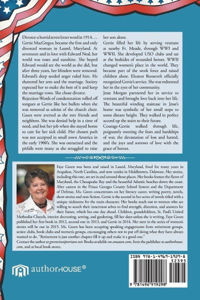 Divorce-a horrid seven letter word in 1914?. Gertie MacGregor, became the first and only divorced woman in Laurel, Maryland. At seventeen and in love with Edward Neal, her world was roses and sunshine. She hoped Edward would see the world as she did, but after three years, her blinders were removed. Edward?s deep seeded anger ruled him. He shattered her arm and the marriage. Society expected her to make the best of it and keep the marriage vows. She chose divorce. Rejection-Words of condemnation rolled off tongues at Gertie like hot bullets when she was removed as soloist of the church choir. Gazes were averted as she met friends and neighbors. She was denied help in a time of need, and lost her job when she stayed home to care for her sick child. Her chosen path was not accepted in small town America in the early 1900?s. She was ostracized and the pitfalls were many as she struggled to raise her son alone. Gertie filled her life by serving veterans at nearby Ft. Meade, through WWI and WWII. She developed USO clubs and sat at the bedsides of wounded heroes. WWII changed women?s place in the world. They became part of the work force and raised children alone. Eleanor Roosevelt officially recognized Gertie?s service. She was redeemed her in the eyes of her community. Jesse Morgan partnered her in service to veterans and brought love back into her life. The beautiful winding staircase in Jesse?s home was symbolic of her small steps to some distant height. They walked in perfect accord up the stairs to their future. Courage-Gertie walked through life, poignantly meeting the fears and hardships of war, the devastation of loss and hatred, and the joys and sorrows of love with the grace of heroes.