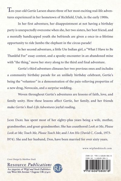 Ten-year-old Gertie Larson shares three of her most exciting real-life adventures experienced in her hometown of Richfield, Utah, in the early 1900s. In her first adventure, her disappointment at not having a birthday party is unexpectedly overcome when she, her two sisters, her best friend, and a mentally handicapped youth she befriends are given a once-in-a-lifetime opportunity to ride Jumbo the elephant in the circus parade! In her second adventure, a little Ute Indian girl, a ""What I Have to Be Thankful For"" essay contest, and a spooky encounter in an abandoned mine with ""the thing,"" move her story along to the third and final adventure. Gertie's third adventure climaxes her two previous ones and includes a community birthday parade for an unlikely birthday celebrant; Gertie's being the ""volunteer"" in a demonstration of the pain-relieving properties of a new drug, Novocain; and a surprise wedding. Woven throughout Gertie's adventures are lessons of faith, love, and family unity. How these lessons affect Gertie, her family, and her friends make Gertie's Real-Life Adventures joyful reading.