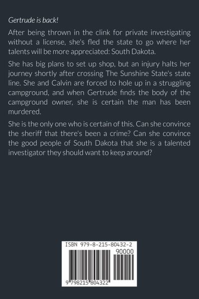 Gertrude is back! After being thrown in the clink for private investigating without a license, she's fled the state to go where her talents will be more appreciated: South Dakota. She has big plans to set up shop, but an injury halts her journey shortly after crossing The Sunshine State's state line. She and Calvin are forced to hole up in a struggling campground, and when Gertrude finds the body of the campground owner, she is certain the man has been murdered. She is the only one who is certain of this. Can she convince the sheriff that there's been a crime? Can she convince the good people of South Dakota that she is a talented investigator they should want to keep around? *The Gertrude in South Dakota Series is a continuation of the Gertrude, Gumshoe Cozy Mystery Series. *This is the large print edition of the book.