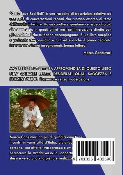 "Gesù Beve Red Bull" è una raccolta di trascrizioni relative ad una serie di conversazioni recenti che ruotano attorno al tema dell'ascolto interiore. Ha un carattere spontaneo e rispecchia ciò che sono stato in questi ultimi mesi nell'interazione diretta con gli ascoltatori che mi hanno accompagnato. E' un libro semplice e profondo che consiglio a tutti ed è anche il primo dedicato interamente ai miei insegnamenti, buona lettura. Marco Canestrari AVVERTENZE: LA LETTURA APPROFONDITA DI QUESTO LIBRO PUO' CAUSARE EFFETTI DESIDERATI QUALI SAGGEZZA E ILLUMINAZIONE. Consumare senza moderazione. web: www.marcocanestari.com mail: gianpaolomarcucci@gmail.com