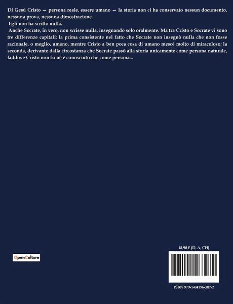 Di Gesù Cristo ¿ persona reale, essere umano ¿ la storia non ci ha conservato nessun documento, nessuna prova, nessuna dimostrazione. Egli non ha scritto nulla. Anche Socrate, in vero, non scrisse nulla, insegnando solo oralmente. Ma tra Cristo e Socrate vi sono tre differenze capitali: la prima consistente nel fatto che Socrate non insegnò nulla che non fosse razionale, o meglio, umano, mentre Cristo a ben poca cosa di umano mescè molto di miracoloso; la seconda, derivante dalla circostanza che Socrate passò alla storia unicamente come persona naturale, laddove Cristo non fu né è conosciuto che come persona...