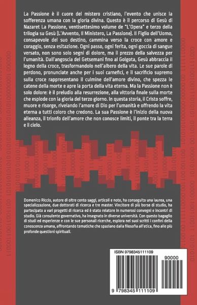 La Passione è il cuore del mistero cristiano, l'evento che unisce la sofferenza umana con la gloria divina. Questo è il percorso di Gesù di Nazaret La Passione, ventisettesimo volume de "L'Opera" e terzo della trilogia su Gesù (L'Avvento, Il Ministero, La Passione). Il Figlio dell'Uomo, consapevole del suo destino, cammina verso la croce con amore e coraggio, senza esitazione. Ogni passo, ogni ferita, ogni goccia di sangue versato, non sono solo segni di dolore, ma il prezzo della salvezza per l'umanità. Dall'angoscia del Getsemani fino al Golgota, Gesù abbraccia il legno della croce, trasformandolo nell'albero della vita. Le sue parole di perdono, pronunciate anche per i suoi carnefici, e il sacrificio supremo sulla croce rappresentano il culmine dell'amore divino, che spezza le catene della morte e apre la porta della vita eterna. Ma la Passione non è solo dolore: è il preludio alla resurrezione, alla vittoria finale sulla morte che esplode con la gloria del terzo giorno. In questa storia, il Cristo soffre, muore e risorge, rivelando l'amore di Dio per l'umanità e offrendo la vita eterna a tutti coloro che credono. La sua Passione è l'inizio della nuova alleanza, il trionfo dell'amore che non conosce limiti, il ponte tra la terra e il cielo.
