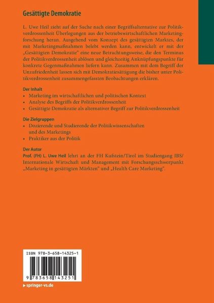 L. Uwe Heil zieht auf der Suche nach einer Begriffsalternative zur Politikverdrossenheit Überlegungen aus der betriebswirtschaftlichen Marketingforschung heran. Ausgehend vom Konzept des gesättigten Marktes, der mit Marketingmaßnahmen belebt werden kann, entwickelt er mit der "Gesättigten Demokratie" eine neue Betrachtungsweise, die den Terminus der Politikverdrossenheit ablösen und gleichzeitig Anknüpfungspunkte für konkrete Gegenmaßnahmen liefern kann. Zusammen mit dem Begriff der Unzufriedenheit lassen sich mit Demokratiesättigung die bisher unter Politikverdrossenheit zusammengefassten Beobachtungen erklären.