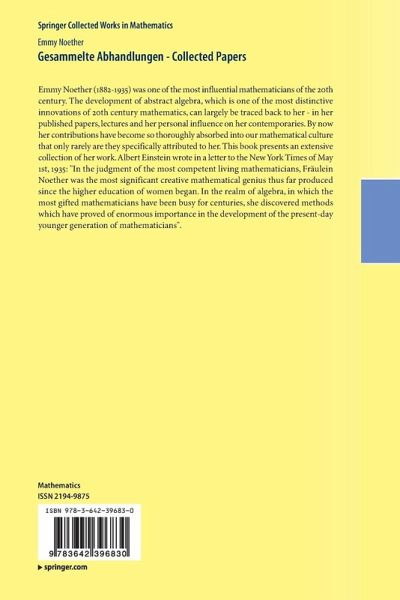 In Memory of Emmy Noether.- 1. Über die Bildung des Formensystems der ternären biquadratischen Form.- 2. Über die Bildung des Formensystems der ternären biquadratischen Form.- 3. Zur Invariantentheorie der Formen von n Variabeln.- 4. Zur Invariantentheorie der Formen von n Variabeln.- 5. Rationale Funktionenkörper.- 6. Körper und Systeme rationaler Funktionen.- 7. Der Endlichkeitssatz der Invarianten endlicher Gruppen.- 8. Über ganze rationale Darstellung der Invarianten eines Systems von beliebig vielen Grundformen.- 9. Die allgemeinsten Bereiche aus ganzen transzendenten Zahlen.- 10. Die Funktionalgleichungen der isomorphen Abbildung.- 11. Gleichungen mit vorgeschriebener Gruppe.- 12. Invarianten beliebiger Differentialausdrücke.- 13. Invariante Variationsprobleme.- 14. Die arithmetische Theorie der algebraischen Funktionen einer Veränderlichen in ihrer Beziehung zu den iibrigen Theorien und zu der Zahlkörpertheorie.- 15. Die Endlichkeit des Systems der ganzzahligen Invarianten binärer Formen.- 16. Zur Reihenentwicklung in der Formentheorie.- 17. Gemeinsam mit W. Schmeidler: Moduln in nichtkommutativen Bereichen, insbesondere aus Differential- und Differenzenäusdrticken.- 18. Über eine Arbeit des im Kriege gefallenen K. Hentzelt zur Eliminationstheorie.- 19. Idealtheorie in Ringbereichen.- 20. Ein algebraisches Kriterium für absolute Irreduzibilität.- 21. Formale Variationsrechnung und Differentialinvarianten.- 22. Bearbeitung von K. Hentzelt : Zur Theorie der Polynomideale und Resultanten.- 23. Algebraische und Differentialvarianten.- 24. Eliminationstheorie und allgemeine Idealtheorie.- 25. Eliminationstheorie und Idealtheorie.- 26. Abstrakter Aufbau der Idealtheorie im algebraischen Zahlkörper.- 27. Hilbertsche Anzahlen in der Idealtheorie.- 28.Gruppencharaktere und Idealtheorie.- 29. Der Endlichkeitssatz der Invarianten endlicher linearer Gruppen der Charakteristik p.- 30. Abstrakter Aufbau der Idealtheorie in algebraischen Zahl-und Funktionenkörpern.- 31. Der Diskriminantensatz für die Ordnungen eines algebraischen Zahl- oder Funktionenkörpers.- 32. Gemeinsam mit R. Brauer: Über minimale Zerfallungskörper irreduzibler Darstellungen.- 33. Hyperkomplexe GroBen und Darstellungstheorie in arithmetischer Auffassung.- 34. Hyperkomplexe Größen und Darstellungstheorie.- 35. Über Maximalbereiche aus ganzzahligen Funktionen.- 36. Idealdifferentiation und Differente.- 37. Normalbasis bei Körpern ohne höhere Verzweigung.- 38. Gemeinsam mit R. Brauer und H. Hasse: Beweis eines Hauptsatzes in der Theorie der Algebren.- 39. Hyperkomplexe Systeme in ihren Beziehungen zur kommutativen Algebra und zur Zahlentheorie.- 40. Nichtkommutative Algebren.- 41. Der Hauptgeschlechtssatz für relativ-galoissche Zahlkörper.- 42. Zerfallende verschränkte Produkte und ihre Maximalordnungen.- 43. Idealdifferentiation und Differente.- Algebra der hyperkomplexen Größen: Vorlesung von E. Noether, W. S. 1929/30. Ausgearbeitet von M. Deuring.- Notwendige und hinreichende Multiplizitätsbedingungen zum Noetherschen Fundamentalsatz der algebraischen Funktionen: von H. Kapferer (Mit einem Zusatz, gemeinsam mit E. Noether).- Bibliographie.- Liste der Kurzmitteilungen und Buchbesprechungen von Emmy Noether.