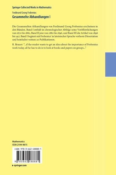 Die Gesammelten Abhandlungen von Ferdinand Georg Frobenius erscheinen in drei Bänden. Band I enthält in chronologischer Abfolge seine Veröffentlichungen von 1870 bis 1880, Band II jene von 1880 bis 1896, und Band III die Artikel von 1896 bis 1917. Band I beginnt mit Frobenius' in lateinischer Sprache verfasste Dissertation und beinhaltet weitere 20 Publikationen.R. Brauer: "...if the reader wants to get an idea about the importance of Frobenius work today, all he has to do is to look at books and papers on groups..."