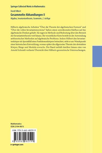 Hilberts algebraische Arbeiten "Über die Theorie der algebraischen Formen" und "Über die vollen Invariantensysteme" haben einen umwälzenden Einfluss auf das algebraische Denken gehabt. Sie ragen in Methode und Bedeutung über den Bereich der Invariantentheorie weit hinaus. Ihr wesentlicher Kern besteht in der Anwendung arithmetischer Methoden auf algebraische Probleme. Indem Hilbert den Invariantenkörper als Spezialfall eines Funktionenkörpers betrachtet, steht er am Wendepunkt einer historischen Entwicklung, woraus später die allgemeine Theorie der abstrakten Körper, Ringe und Moduln erwuchs.Der Band enthält darüber hinaus eine von Arnold Schmidt verfasste Übersicht über Hilberts geometrische Untersuchungen.