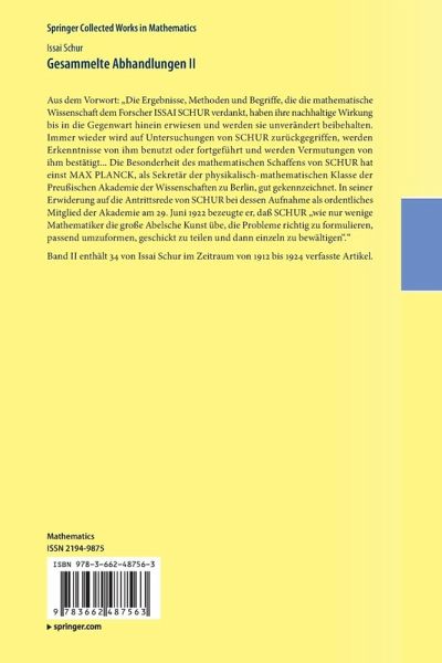 Aus dem Vorwort: "Die Ergebnisse, Methoden und Begriffe, die die mathematische Wissenschaft dem Forscher ISSAI SCHUR verdankt, haben ihre nachhaltige Wirkung bis in die Gegenwart hinein erwiesen und werden sie unverändert beibehalten. Immer wieder wird auf Untersuchungen von SCHUR zurückgegriffen, werden Erkenntnisse von ihm benutzt oder fortgeführt und werden Vermutungen von ihm bestätigt... Die Besonderheit des mathematischen Schaffens von SCHUR hat einst MAX PLANCK, als Sekretär der physikalisch-mathematischen Klasse der Preußischen Akademie der Wissenschaften zu Berlin, gut gekennzeichnet. In seiner Erwiderung auf die Antrittsrede von SCHUR bei dessen Aufnahme als ordentliches Mitglied der Akademie am 29. Juni 1922 bezeugte er, daß SCHUR "wie nur wenige Mathematiker die große Abelsche Kunst übe, die Probleme richtig zu formulieren, passend umzuformen, geschickt zu teilen und dann einzeln zu bewältigen"." Band II enthält 34 von Issai Schur im Zeitraum von 1912 bis 1924 verfasste Artikel.