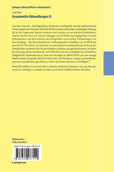 Aus dem Vorwort: "Die Ergebnisse, Methoden und Begriffe, die die mathematische Wissenschaft dem Forscher ISSAI SCHUR verdankt, haben ihre nachhaltige Wirkung bis in die Gegenwart hinein erwiesen und werden sie unverändert beibehalten. Immer wieder wird auf Untersuchungen von SCHUR zurückgegriffen, werden Erkenntnisse von ihm benutzt oder fortgeführt und werden Vermutungen von ihm bestätigt... Die Besonderheit des mathematischen Schaffens von SCHUR hat einst MAX PLANCK, als Sekretär der physikalisch-mathematischen Klasse der Preußischen Akademie der Wissenschaften zu Berlin, gut gekennzeichnet. In seiner Erwiderung auf die Antrittsrede von SCHUR bei dessen Aufnahme als ordentliches Mitglied der Akademie am 29. Juni 1922 bezeugte er, daß SCHUR "wie nur wenige Mathematiker die große Abelsche Kunst übe, die Probleme richtig zu formulieren, passend umzuformen, geschickt zu teilen und dann einzeln zu bewältigen"."Band III enthält 28 von Issai Schur verfasste Artikel ab 1925 sowie u.a.Inhalte aus dem nicht veröffentlichten Nachlass.