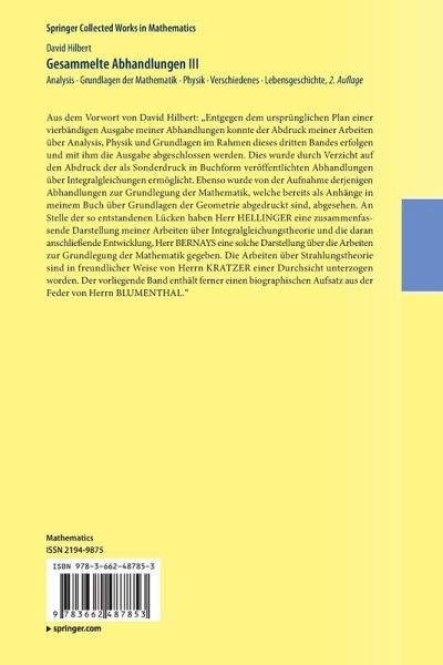 Aus dem Vorwort von David Hilbert: "Entgegen dem ursprünglichen Plan einer vierbändigen Ausgabe meiner Abhandlungen konnte der Abdruck meiner Arbeiten über Analysis, Physik und Grundlagen im Rahmen dieses dritten Bandes erfolgen und mit ihm die Ausgabe abgeschlossen werden. Dies wurde durch Verzicht auf den Abdruck der als Sonderdruck in Buchform veröffentlichten Abhandlungen über Integralgleichungen ermöglicht. Ebenso wurde von der Aufnahme derjenigen Abhandlungen zur Grundlegung der Mathematik, welche bereits als Anhänge in meinem Buch über Grundlagen der Geometrie abgedruckt sind, abgesehen. An Stelle der so entstandenen Lücken haben Herr HELLINGER eine zusammenfassende Darstellung meiner Arbeiten über Integralgleichungstheorie und die daran anschließende Entwicklung, Herr BERNAYS eine solche Darstellung über die Arbeiten zur Grundlegung der Mathematik gegeben. Die Arbeiten über Strahlungstheorie sind in freundlicher Weise von Herrn KRATZER einer Durchsicht unterzogen worden. Der vorliegende Band enthält ferner einen biographischen Aufsatz aus der Feder von Herrn BLUMENTHAL."