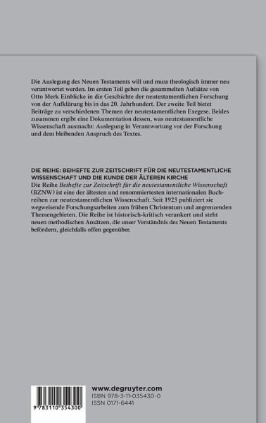 Die Auslegung des Neuen Testaments will und muss theologisch immer neu verantwortet werden. Die gesammelten Aufsätze von Otto Merk geben Einblicke in die Geschichte der neutestamentlichen Forschung von der Aufklärung bis in das 20. Jahrhundert. Beiträge zu verschiedenen Themen der neutestamentlichen Exegese zeigen, was neutestamentliche Wissenschaft ausmacht: Auslegung in Verantwortung vor der Forschung und dem bleibenden Anspruch des Textes.