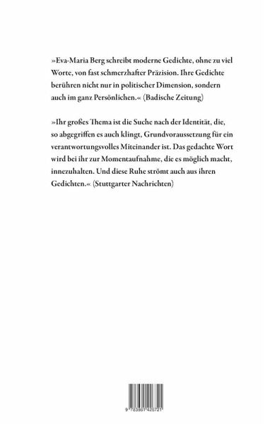 Geboren 1949 in Düsseldorf, studierte Germanistik und Romanistik in Freiburg und lebt in Waldkirch. Sie schreibt Lyrik, Prosa und Essays. Insbesondere im deutsch-franzö-sischen Raum wirkt sie immer wieder grenzüberschreitend bei Projekten, Übersetzungen, interdisziplinären Zusammenarbeiten und Veranstaltungen mit und erhielt wiederholt Einladungen von Kunstzentren in Südfrankreich sowie Spanien zu Schreibstipendien. Ihre zahlreichen Bücher und Künstlerbücher sind in Deutschland, Frankreich und in der Schweiz erschienen, seit 2010 vorwiegend in Frankreich, zwei- oder dreisprachig (deutsch, französisch, englisch, spanisch) sowie mit Illustrationen von Bildenden Künstlern. Siehe ihre Homepage: www.eva-maria-berg.de