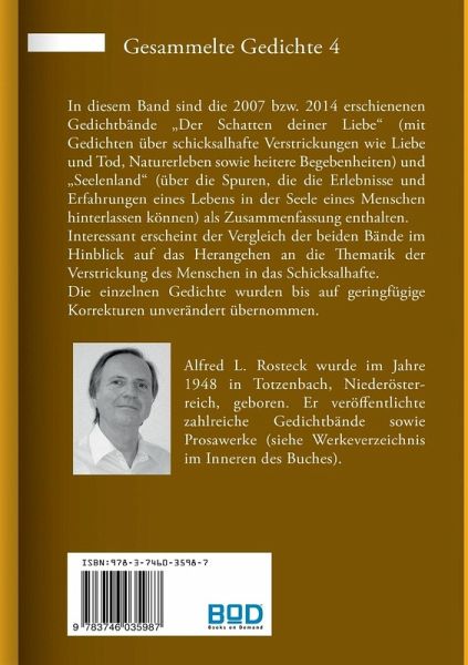 In diesem Band sind die 2007 bzw. 2014 erschienenen Gedichtbände "Der Schatten deiner Liebe" (mit Gedichten über schicksalhafte Verstrickungen wie Liebe und Tod, Naturerleben sowie heitere Begebenheiten) und "Seelenland" (über die Spuren, die die Erlebnisse und Erfahrungen eines Lebens in der Seele eines Menschen hinterlassen können) als Zusammenfassung enthalten. Interessant erscheint der Vergleich der beiden Bände im Hinblick auf das Herangehen an die Thematik der Verstrickung des Menschen in das Schicksalhafte. Die einzelnen Gedichte wurden bis auf geringfügige Korrekturen unverändert übernommen.