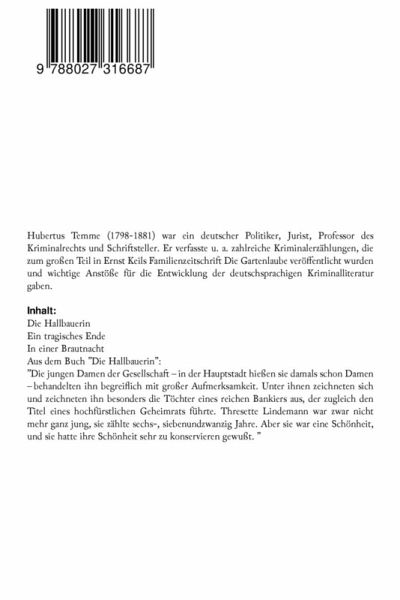 Hubertus Temme (1798-1881) war ein deutscher Politiker, Jurist, Professor des Kriminalrechts und Schriftsteller. Er verfasste u. a. zahlreiche Kriminalerzählungen, die zum großen Teil in Ernst Keils Familienzeitschrift Die Gartenlaube veröffentlicht wurden und wichtige Anstöße für die Entwicklung der deutschsprachigen Kriminalliteratur gaben. Inhalt: - Die Hallbauerin - Ein tragisches Ende - In einer Brautnacht - Aus dem Buch "Die Hallbauerin" - "Die jungen Damen der Gesellschaft - in der Hauptstadt hießen sie damals schon Damen - behandelten ihn begreiflich mit großer Aufmerksamkeit. Unter ihnen zeichneten sich und zeichneten ihn besonders die Töchter eines reichen Bankiers aus, der zugleich den Titel eines hochfürstlichen Geheimrats führte. Thresette Lindemann war zwar nicht mehr ganz jung, sie zählte sechs-, siebenundzwanzig Jahre. Aber sie war eine Schönheit, und sie hatte ihre Schönheit sehr zu konservieren gewußt. "