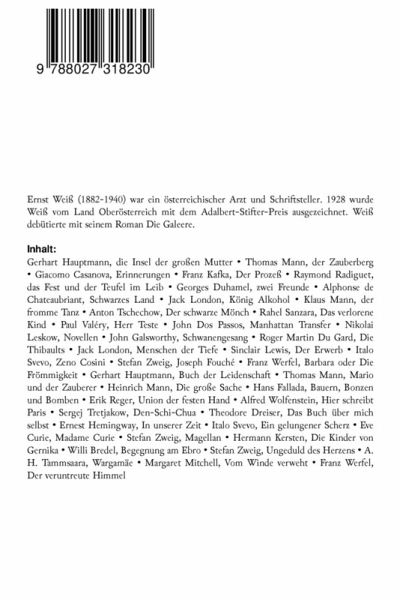 Ernst Weiß (1882-1940) war ein österreichischer Arzt und Schriftsteller. 1928 wurde Weiß vom Land Oberösterreich mit dem Adalbert-Stifter-Preis ausgezeichnet. Weiß debütierte mit seinem Roman Die Galeere. Inhalt: - Gerhart Hauptmann, die Insel der großen Mutter - Thomas Mann, der Zauberberg - Giacomo Casanova, Erinnerungen - Franz Kafka, Der Prozeß - Raymond Radiguet, das Fest und der Teufel im Leib - Georges Duhamel, zwei Freunde - Alphonse de Chateaubriant, Schwarzes Land - Jack London, König Alkohol - Klaus Mann, der fromme Tanz - Anton Tschechow, Der schwarze Mönch - Rahel Sanzara, Das verlorene Kind - Paul Valéry, Herr Teste - John Dos Passos, Manhattan Transfer - Nikolai Leskow, Novellen - John Galsworthy, Schwanengesang - Roger Martin Du Gard, Die Thibaults - Jack London, Menschen der Tiefe - Sinclair Lewis, Der Erwerb - Italo Svevo, Zeno Cosini - Stefan Zweig, Joseph Fouché - Franz Werfel, Barbara oder Die Frömmigkeit - Gerhart Hauptmann, Buch der Leidenschaft - Thomas Mann, Mario und der Zauberer - Heinrich Mann, Die große Sache - Hans Fallada, Bauern, Bonzen und Bomben - Erik Reger, Union der festen Hand - Alfred Wolfenstein, Hier schreibt Paris - Sergej Tretjakow, Den-Schi-Chua - Theodore Dreiser, Das Buch über mich selbst - Ernest Hemingway, In unserer Zeit - Italo Svevo, Ein gelungener Scherz - Eve Curie, Madame Curie - Stefan Zweig, Magellan - Hermann Kersten, Die Kinder von Gernika - Willi Bredel, Begegnung am Ebro - Stefan Zweig, Ungeduld des Herzens - A. H. Tammsaara, Wargamäe - Margaret Mitchell, Vom Winde verweht - Franz Werfel, Der veruntreute Himmel