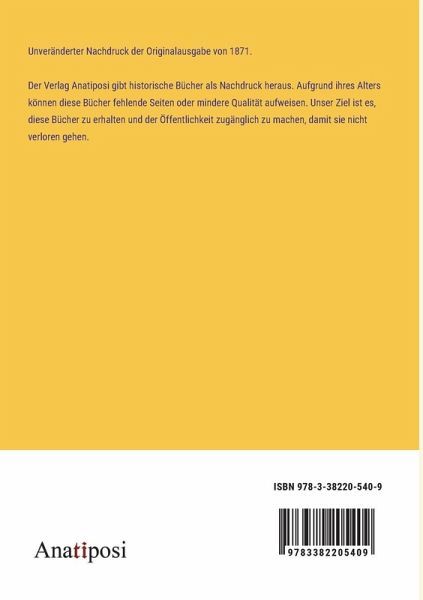Unveränderter Nachdruck der Originalausgabe von 1871. Der Verlag Anatiposi gibt historische Bücher als Nachdruck heraus. Aufgrund ihres Alters können diese Bücher fehlende Seiten oder mindere Qualität aufweisen. Unser Ziel ist es, diese Bücher zu erhalten und der Öffentlichkeit zugänglich zu machen, damit sie nicht verloren gehen.