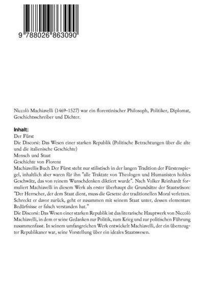 Niccolò Machiavelli (1469-1527) war ein florentinischer Philosoph, Politiker, Diplomat, Geschichtsschreiber und Dichter. Inhalt: . Der Fürst . Die Discorsi: Das Wesen einer starken Republik (Politische Betrachtungen über die alte und die italienische Geschichte) . Mensch und Staat . Geschichte von Florenz . Machiavellis Buch Der Fürst steht nur stilistisch in der langen Tradition der Fürstenspiegel, inhaltlich aber waren für ihn "alle Traktate von Theologen und Humanisten hohles Geschwätz, das von reinem Wunschdenken diktiert wurde". Nach Volker Reinhardt formuliert Machiavelli in diesem Werk als erster überhaupt die Grundsätze der Staatsräson: "Der Herrscher, der dem Staat dient, muss die Gesetze der traditionellen Moral verletzen. Schreckt er davor zurück, geht er zusammen mit seinem Staat unter, dessen elementare Bedürfnisse er falsch verstanden hat." . Die Discorsi: Das Wesen einer starken Republik ist das literarische Hauptwerk von Niccolò Machiavelli, in dem er seine Gedanken zur Politik, zum Krieg und zur politischen Führung zusammenfasst. In seinem umfangreichen Werk entwickelt Machiavelli, der ein überzeugter Republikaner war, seine Vorstellung über ein ideales Staatswesen.