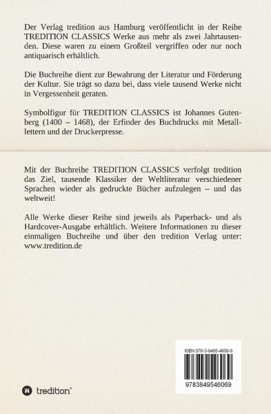 Dieses Werk ist Teil der Buchreihe TREDITION CLASSICS. Der Verlag tredition aus Hamburg veröffentlicht in der Buchreihe TREDITION CLASSICS Werke aus mehr als zwei Jahrtausenden. Diese waren zu einem Großteil vergriffen oder nur noch antiquarisch erhältlich. Mit der Buchreihe TREDITION CLASSICS verfolgt tredition das Ziel, tausende Klassiker der Weltliteratur verschiedener Sprachen wieder als gedruckte Bücher zu verlegen und das weltweit! Die Buchreihe dient zur Bewahrung der Literatur und Förderung der Kultur. Sie trägt so dazu bei, dass viele tausend Werke nicht in Vergessenheit geraten.