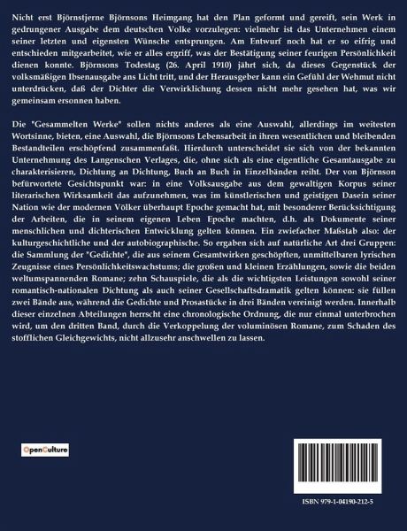 Nicht erst Björnstjerne Björnsons Heimgang hat den Plan geformt und gereift, sein Werk in gedrungener Ausgabe dem deutschen Volke vorzulegen: vielmehr ist das Unternehmen einem seiner letzten und eigensten Wünsche entsprungen. Am Entwurf noch hat er so eifrig und entschieden mitgearbeitet, wie er alles ergriff, was der Bestätigung seiner feurigen Persönlichkeit dienen konnte. Björnsons Todestag (26. April 1910) jährt sich, da dieses Gegenstück der volksmäßigen Ibsenausgabe ans Licht tritt, und der Herausgeber kann ein Gefühl der Wehmut nicht unterdrücken, daß der Dichter die Verwirklichung dessen nicht mehr gesehen hat, was wir gemeinsam ersonnen haben. Die "Gesammelten Werke" sollen nichts anderes als eine Auswahl, allerdings im weitesten Wortsinne, bieten, eine Auswahl, die Björnsons Lebensarbeit in ihren wesentlichen und bleibenden Bestandteilen erschöpfend zusammenfaßt. Hierdurch unterscheidet sie sich von der bekannten Unternehmung des Langenschen Verlages, die, ohne sich als eine eigentliche Gesamtausgabe zu charakterisieren, Dichtung an Dichtung, Buch an Buch in Einzelbänden reiht. Der von Björnson befürwortete Gesichtspunkt war: in eine Volksausgabe aus dem gewaltigen Korpus seiner literarischen Wirksamkeit das aufzunehmen, was im künstlerischen und geistigen Dasein seiner Nation wie der modernen Völker überhaupt Epoche gemacht hat, mit besonderer Berücksichtigung der Arbeiten, die in seinem eigenen Leben Epoche machten, d.h. als Dokumente seiner menschlichen und dichterischen Entwicklung gelten können. Ein zwiefacher Maßstab also: der kulturgeschichtliche und der autobiographische. So ergaben sich auf natürliche Art drei Gruppen: die Sammlung der "Gedichte", die aus seinem Gesamtwirken geschöpften, unmittelbaren lyrischen Zeugnisse eines Persönlichkeitswachstums; die großen und kleinen Erzählungen, sowie die beiden weltumspannenden Romane; zehn Schauspiele, die als die wichtigsten Leistungen sowohl seiner romantisch-nationalen Dichtung als auch seiner Gesellschaftsdramatik gelten können: sie füllen zwei Bände aus, während die Gedichte und Prosastücke in drei Bänden vereinigt werden. Innerhalb dieser einzelnen Abteilungen herrscht eine chronologische Ordnung, die nur einmal unterbrochen wird, um den dritten Band, durch die Verkoppelung der voluminösen Romane, zum Schaden des stofflichen Gleichgewichts, nicht allzusehr anschwellen zu lassen.