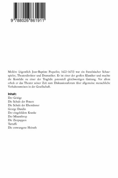 Molière (eigentlich Jean-Baptiste Poquelin; 1622-1673) war ein französischer Schauspieler, Theaterdirektor und Dramatiker. Er ist einer der großen Klassiker und machte die Komödie zu einer der Tragödie potenziell gleichwertigen Gattung. Vor allem erhob er das Theater seiner Zeit zum Diskussionsforum über allgemeine menschliche Verhaltensweisen in der Gesellschaft. Inhalt: . Der Geizige . Die Schule der Frauen . Die Schule der Ehemänner . George Dandin . Der eingebildete Kranke . Der Misanthrop . Die Zierpuppen . Tartuffe . Die erzwungene Heirath