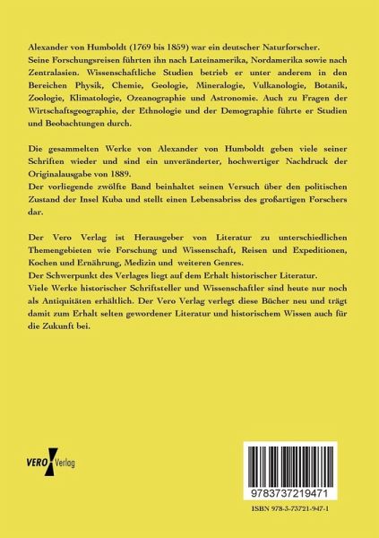 Der vorliegende zwölfte Band beinhaltet seinen Versuch über den politischen Zustand der Insel Kuba und stellt einen Lebensabriss des großartigen Forschers dar.