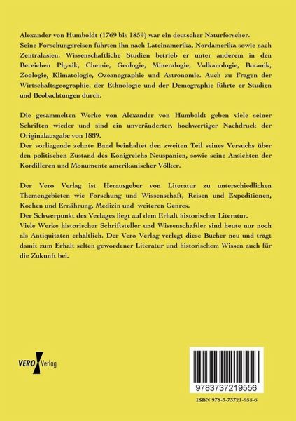 Der vorliegende zehnte Band beinhaltet den zweiten Teil seines Versuchs über den politischen Zustand des Königreichs Neuspanien, sowie seine Ansichten der Kordilleren und Monumente amerikanischer Völker.