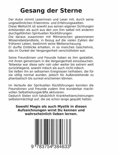Gesang der SterneDer Autor nimmt Leserinnen und Leser mit, durch seine ungewöhnlichen Erkenntnis- und Erfahrungswelten.Diese Weltsicht ist sowohl aus seinen eigenen Sichtungen entstanden als auch aus den von ihm selbst mit anderen durchgeführten Spirituellen Rückführungen.Die daraus zusammen mit Mitmenschen gewonnenen Wissensbestandteile, in Bezug auf die vielen Zyklen der früheren Leben, bestimmt seine Weltanschauung.Er durfte Einblicke erhalten, in so manches Geschehnis, das im Dunkel der Vergangenheit verschütteten war.Seine Freundinnen und Freunde haben es ihm gestattet, mit ihnen gemeinsam in die Vergangenheit einzutauchen. Teilweise war diese sehr nah oder weiter bis extrem weit zurückliegend, sowohl irdisch als auch nicht-irdisch.Sie ließen ihn an seltsamen Ereignissen teilhaben, die für sie völlig normal wurden, jedoch für Außenstehende zu phantastisch bis surreal erscheinen können.Im Verlaufe der Spirituellen Rückführungen konnten die Freundinnen und Freunde zudem ihre wunderbar machtvollen Selbstheilungskräfte aktivieren.Dadurch lösten sich tatsächlich Krankheitserscheinungen selbstermächtigt auf, die sie schon lange gequält hatten.Sowohl Magie als auch Mystik in diesen Aufzeichnungen wirst Du kennen und wahrscheinlich lieben lernen.