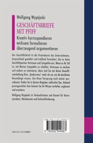Es ist verblüffend einfach, gute - nicht "schöne" - Korrespon denz zu praktizieren. Als Sekretärin sind Sie sicher daran inter essiert, mit Ihrem Mitteilungsstil "anzukommen" und das ge wünschte Verhalten beim Geschäftspartner auszulösen. Tagtäg lich erledigen Sie selbständig den Schriftverkehr. Plötzlich wissen Sie etwas nicht oder nicht so richtig. In diesem Buch finden Sie auf (fast) alle Fragen eine Antwort. Wie baue ich ein Schreiben systematisch, logisch und gefällig auf? Wie vermeide ich überholte Ausdrücke, Floskeln oder umständliche Schreib weisen? Wie schreibe ich DIN 5008-gerecht? Wie lauten die Zweifelsfälle in der Korrespondenz? Wenn es Ihr Stil ist, mit weniger Worten mehr zu sagen, Sie sich einfach, klar und er folgreich mitteilen wollen, dann haben Sie mit diesem Buch eine sehr gute Wabl getroffen. Sie sollten es immer griffbereit an Ihrem Arbeitsplatz haben, falls Sie mal etwas nachschlagen wollen. Wolfgang Wypijeski 5 --------Inhalt vorwort . . . . . . . . . . .. . . . . . . . . . . . . . . . . . . . . . . . . . . . . . . . . . . . . . . . . . . . . . . . . . . . . . . . . . . . . . . . . . . . . . . . . . . . . . 5 1. Einleitung . . . . . . . . . . . . . . . . . . . . . . . . . . . . . . . . . . . . . . . . . . . . . . . . . . . . . . . . . . . . . . . . . . . . . 13 2. Visitenkarte Brief . . . . . . . . . . . . . . . . . . . . . . . . . . . . . . . . . . . . . . . . . . . . . . . . . . . . 17 2. 1 CI und CD im Briefkopf. . . . . . . . . . . . . . . . . . . . . . . . . . . . . . . . . . . . . . . . . . . . . . . 18 2. 2 Test: Gestaltung des Geschäftsbriefes . . . . . . . . . . . . . . . . . . . . . . . . . . . 21 2. 3 Gestaltung des Briefumschlags . . . . . . . . . . . . . . . . . . . . . . . . . . . . . . . . . . . . . .30 2. 4 Anschriften . . . . . . . . . . . . . . . . . . . . . . . . . . . . . . . . . . . . . . . . . . . . . . . . . . . . . . . . . . . . . . . . . . . . . 30 2. 5 Brieftypen . . . . . . . . . . . . . . . . . . . . .. . . . . . . . . . . . . . . . . . . . . . . . . . . . . . . . . . . . . . . . . . . . . . . . . 34 3. DIN 5008 - Regeln für Maschinenschreiben . . . . . . . . . . . . . . . . . . . . . . . . . . . . . . . . . . . . . . . . . . . . 37 3. 1 Test: Kennen Sie die korrekten Schreibweisen? . . . . . . . . . . . . . . . . . . . . . . . . . . . . . . . . . . . . . . . . . . . . . . . . . . . . . . . . . . . . 38 3. 2 Wie schreibe ich Straßennamen richtig? . . . . . . . . . . . . . . . . . . . . . 42 3. 3 Buchstabier-Alphabet für Diktat und Text. . . . . . . . . . . . . . . . . . 45 3. 4 Musterbrief A4 (Vorschlag) . . . . . . . . . . . . . . . . . . . . . . . . . . . . . . . . . . . . . . . . 46 7 3. 5 Die 7 Briefelemente . . . . . . . . . . . . . . . . . . . . . . . . . . . . . . . . . . . . . . . . . . . . . . . . . . . . 47 3. 6 Abkürzungen . . . . . . . . . . . . . . . . . . . . . . . . . . . . . . . . . . . . . . . . . . . . . . . . . . . . . . . . . . . . . . . 48 4. Korrespondieren mit Fantasie, Geist und Gefühl . . . . . . . . . . . . . . . . . . . . . . . . . . . . . . . . . . . . . . . . . . . . . . . . . . . . . 55 4. 1 Wie praktiziere ich den modemen Mitteilungsstil? . . . . . . . . . . . . . . . . . . . . . . . . . . . . . . . . . . . . . . . . . . . . . . . . . . . . . . . . . . . .