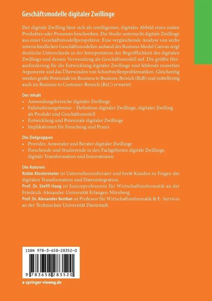 Der digitale Zwilling lässt sich als intelligentes, digitales Abbild eines realen Produktes oder Prozesses beschreiben. Die Studie untersucht digitale Zwillinge aus einer Geschäftsmodellperspektive. Eine vergleichende Analyse von sechs unterschiedlichen Geschäftsmodellen anhand des Business Model Canvas zeigt deutliche Unterschiede in der Interpretation der Begrifflichkeit des digitalen Zwillings und dessen Verwendung als Geschäftsmodell auf. Die größte Herausforderung für die Entwicklung digitaler Zwillinge sind fehlende monetäre Argumente und das Überwinden von Schnittstellenproblematiken. Gleichzeitig werden große Potenziale im Business to Business-Bereich (B2B) und mittelfristig auch im Business to Customer-Bereich (B2C) erwartet.
