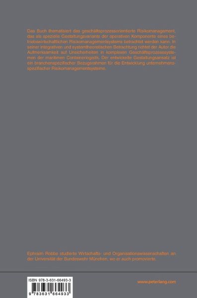 Das Buch thematisiert das geschäftsprozessorientierte Risikomanagement, das als spezielle Gestaltungsvariante der operativen Komponente eines betriebswirtschaftlichen Risikomanagementsystems betrachtet werden kann. In seiner integrativen und systemtheoretischen Betrachtung richtet der Autor die Aufmerksamkeit auf Unsicherheiten in komplexen Geschäftsprozesssystemen der maritimen Containerlogistik. Der entwickelte Gestaltungsansatz ist ein branchenspezifischer Bezugsrahmen für die Entwicklung unternehmensspezifischer Risikomanagementsysteme.