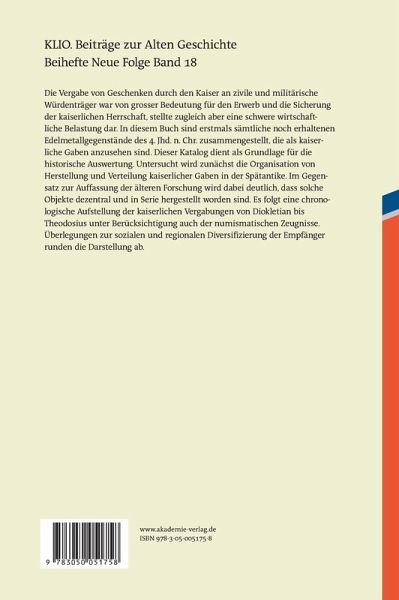 Die Vergabe von Geschenken durch den Kaiser an zivile und militärische Würdenträger war von großer Bedeutung für den Erwerb und die Sicherung der kaiserlichen Herrschaft, stellte zugleich aber eine schwere wirtschaftliche Belastung dar. In diesem Buch sind erstmals sämtliche noch erhaltenen Edelmetallgegenstände des 4. Jhd. n. Chr. zusammengestellt, die als kaiserliche Gaben anzusehen sind. Dieser Katalog dient als Grundlage für die historische Auswertung. Untersucht wird zunächst die Organisation von Herstellung und Verteilung kaiserlicher Gaben in der Spätantike. Im Gegensatz zur Auffassung der älteren Forschung wird dabei deutlich, dass solche Objekte dezentral und in Serie hergestellt worden sind. Es folgt eine chronologische Aufstellung der kaiserlichen Vergabungen von Diokletian bis Theodosius unter Berücksichtigung auch der numismatischen Zeugnisse. Überlegungen zur sozialen und regionalen Diversifizierung der Empfänger runden die Darstellung ab.