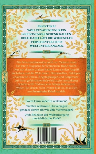 Eigentlich wollte Yadenin nur ein Geburtstagsgeschenk kaufen.Doch dabei löst die Wiesenelfe versehentlich den Weltuntergang aus.Die Schattendimension greift an! Yadenin muss das letzte Fragment der Steinernen Träne finden. Nur mit diesem uralten Relikt kann sie den Angriff aufhalten und die Welt retten.Devisenelfen, Dyklopen, urlaubsreife Unken, Kryptogeologen und Klagemoos - auf ihrer gefährlichen Reise bis in ein versunkenes Schloss trifft Yadenin eine Menge fabelhafter Wesen, bei denen nicht immer klar ist, ob es sich um Freund oder Feind handelt.Wem kann Yadenin vertrauen?Treffen schlimme Hervorsagen genauso sicher ein wie üble Vorhersagen?Und bedeutet der Weltuntergang tatsächlich das Ende?