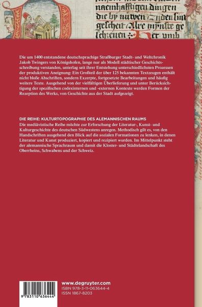 Die um 1400 entstandene deutschsprachige Chronik Jakob Twingers von Königshofen wurde bis in die Neuzeit hinein in über 125 Handschriften abgeschrieben. Ein Großteil der bekannten Textzeugen enthält dabei nicht bloße Abschriften, sondern Exzerpte, fortgesetzte Bearbeitungen und häufig weitere Texte. In der vorliegenden Studie werden die unterschiedlichen Aneignungsformen der Chronik in historischen, politischen bzw. sozialen Zusammenhängen, also handschriftenextern, aber auch im kodikologischen Kontext, also handschriftenintern, analysiert. Nicht ein abstraktes, statisches Werk, sondern die Rezeption von Geschichte aus der Stadt wird in den einzelnen Codices untersucht. Hierfür werden Ansätze aus den Forschungen zu städtischer Geschichtsschreibung, den Cultural Memory Studies, der New Philology und den Material Culture Studies herangezogen. Die Interessen der Rezipient_innen (1. Prozesse der Aneignung), die Überlieferung der Chronik im Zusammenhang mit anderen Texten (2. Prozesse der Kombination) sowie die Funktionsangebote und Funktionen der Chronik aus dem potentiellen bzw. tatsächlichen Gebrauch heraus (3. Prozesse der (Re-)Funktionalisierung) werden dabei anhand ausgewählter Codices bzw. Überlieferungsgruppen herausgearbeitet