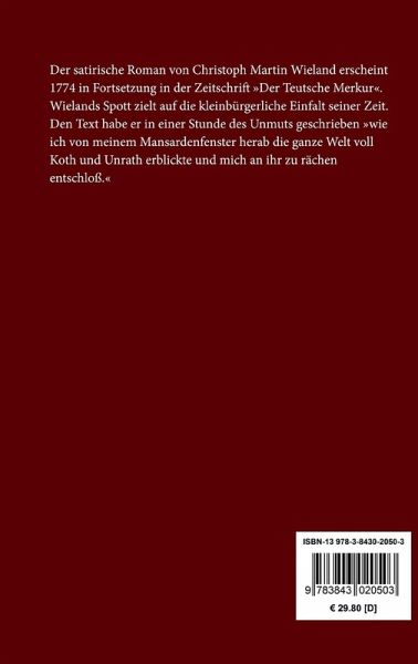 Der satirische Roman von Christoph Martin Wieland erscheint 1774 in Fortsetzung in der Zeitschrift "Der Teutsche Merkur". Wielands Spott zielt auf die kleinbürgerliche Einfalt seiner Zeit. Den Text habe er in einer Stunde des Unmuts geschrieben "wie ich von meinem Mansardenfenster herab die ganze Welt voll Koth und Unrath erblickte und mich an ihr zu rächen entschloß."