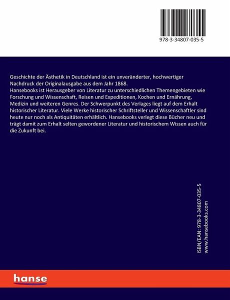 Geschichte der Ästhetik in Deutschland ist ein unveränderter, hochwertiger Nachdruck der Originalausgabe aus dem Jahr 1868.Hansebooks ist Herausgeber von Literatur zu unterschiedlichen Themengebieten wie Forschung und Wissenschaft, Reisen und Expeditionen, Kochen und Ernährung, Medizin und weiteren Genres. Der Schwerpunkt des Verlages liegt auf dem Erhalt historischer Literatur. Viele Werke historischer Schriftsteller und Wissenschaftler sind heute nur noch als Antiquitäten erhältlich. Hansebooks verlegt diese Bücher neu und trägt damit zum Erhalt selten gewordener Literatur und historischem Wissen auch für die Zukunft bei.
