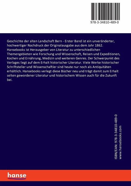 Geschichte der alten Landschaft Bern - Erster Band ist ein unveränderter, hochwertiger Nachdruck der Originalausgabe aus dem Jahr 1862.Hansebooks ist Herausgeber von Literatur zu unterschiedlichen Themengebieten wie Forschung und Wissenschaft, Reisen und Expeditionen, Kochen und Ernährung, Medizin und weiteren Genres. Der Schwerpunkt des Verlages liegt auf dem Erhalt historischer Literatur. Viele Werke historischer Schriftsteller und Wissenschaftler sind heute nur noch als Antiquitäten erhältlich. Hansebooks verlegt diese Bücher neu und trägt damit zum Erhalt selten gewordener Literatur und historischem Wissen auch für die Zukunft bei.