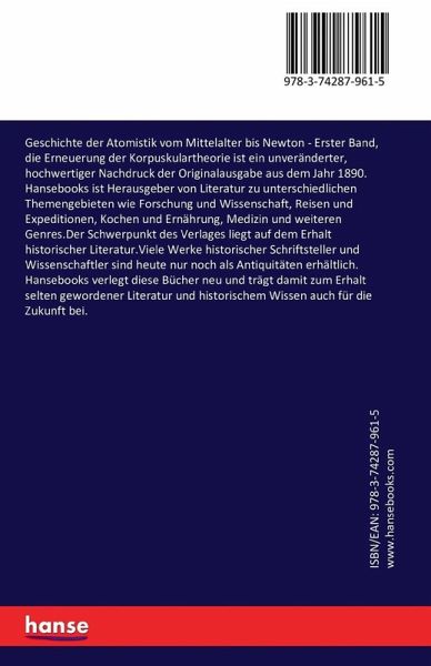 Geschichte der Atomistik vom Mittelalter bis Newton - Erster Band, die Erneuerung der Korpuskulartheorie ist ein unveränderter, hochwertiger Nachdruck der Originalausgabe aus dem Jahr 1890.