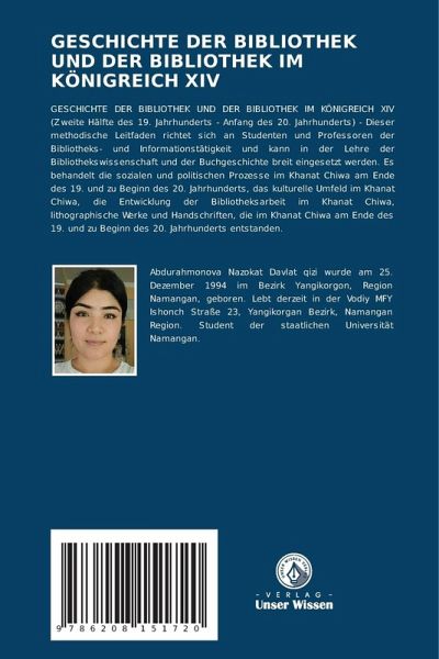 GESCHICHTE DER BIBLIOTHEK UND DER BIBLIOTHEK IM KÖNIGREICH XIV (Zweite Hälfte des 19. Jahrhunderts - Anfang des 20. Jahrhunderts) - Dieser methodische Leitfaden richtet sich an Studenten und Professoren der Bibliotheks- und Informationstätigkeit und kann in der Lehre der Bibliothekswissenschaft und der Buchgeschichte breit eingesetzt werden. Es behandelt die sozialen und politischen Prozesse im Khanat Chiwa am Ende des 19. und zu Beginn des 20. Jahrhunderts, das kulturelle Umfeld im Khanat Chiwa, die Entwicklung der Bibliotheksarbeit im Khanat Chiwa, lithographische Werke und Handschriften, die im Khanat Chiwa am Ende des 19. und zu Beginn des 20. Jahrhunderts entstanden.