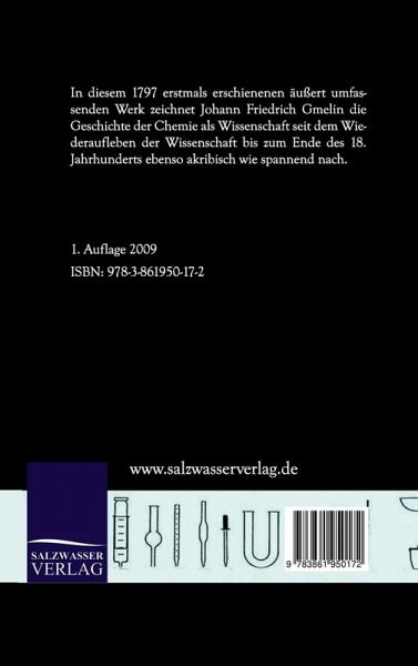 In diesem 1797 erstmals erschienenen äußert umfassenden Werk zeichnet Johann Friedrich Gmelin die Geschichte der Chemie als Wissenschaft seit dem Wiederaufleben der Wissenschaft bis zum Ende des 18. Jahrhunderts ebenso akribisch wie spannend nach.