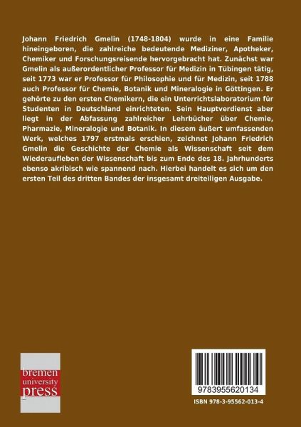 Johann Friedrich Gmelin (1748-1804) wurde in eine Familie hineingeboren, die zahlreiche bedeutende Mediziner, Apotheker, Chemiker und Forschungsreisende hervorgebracht hat. Zunächst war Gmelin als außerordentlicher Professor für Medizin in Tübingen tätig, seit 1773 war er Professor für Philosophie und für Medizin, seit 1788 auch Professor für Chemie, Botanik und Mineralogie in Göttingen. Er gehörte zu den ersten Chemikern, die ein Unterrichtslaboratorium für Studenten in Deutschland einrichteten. Sein Hauptverdienst aber liegt in der Abfassung zahlreicher Lehrbücher über Chemie, Pharmazie, Mineralogie und Botanik. In diesem äußert umfassenden Werk, welches 1797 erstmals erschien, zeichnet Johann Friedrich Gmelin die Geschichte der Chemie als Wissenschaft seit dem Wiederaufleben der Wissenschaft bis zum Ende des 18. Jahrhunderts ebenso akribisch wie spannend nach. Hierbei handelt es sich um den ersten Teil des dritten Bandes der insgesamt dreiteiligen Ausgabe.